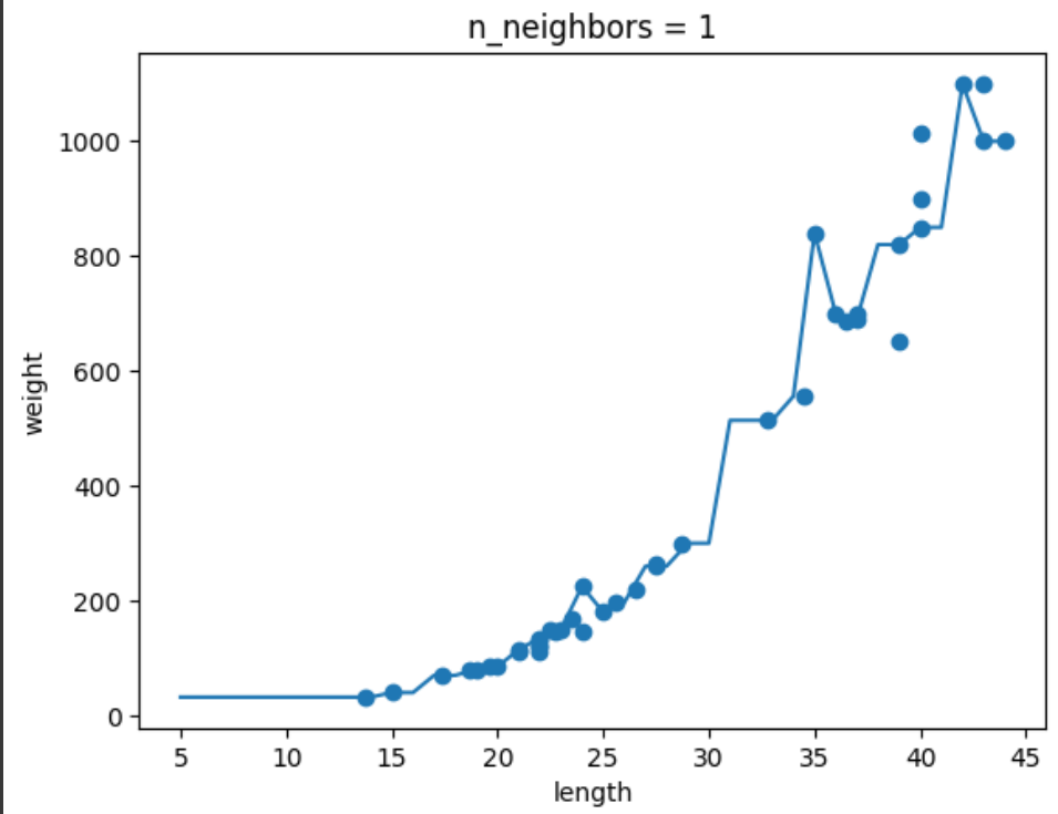 빈칸 부분에는 각각 n과 knr.predict(x)를 넣어주었당.