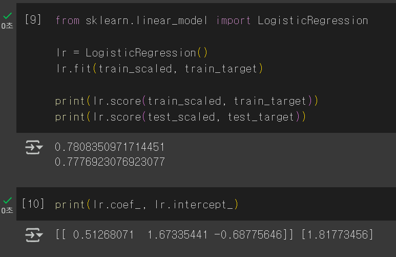 그리고 로지스틱회귀에 학습시키고 정확도 확인 & 계수 확인까지 햇습니당